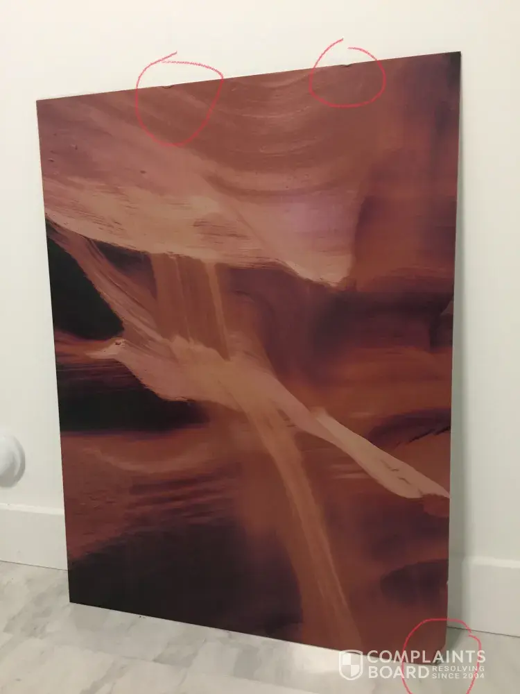 Print arrived dented, the number they give for customer service is out of operation. I can't get them to return my email. Order # US4A3601196306.