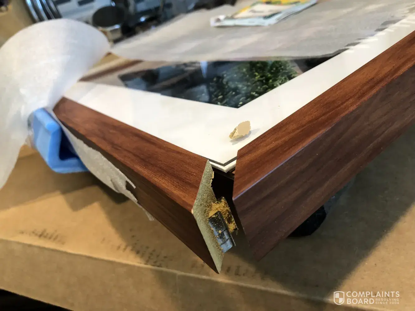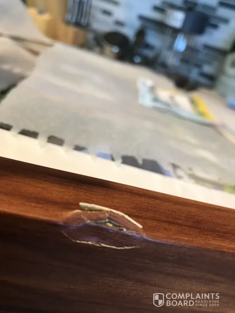Just received my order today via UPS, the driver knocked at my door and left it there. I got it as he was driving away and noticed immediately that the box had two dents on it, I opened it immediately and found that the frame was damaged in two parts. Pictures submitted.