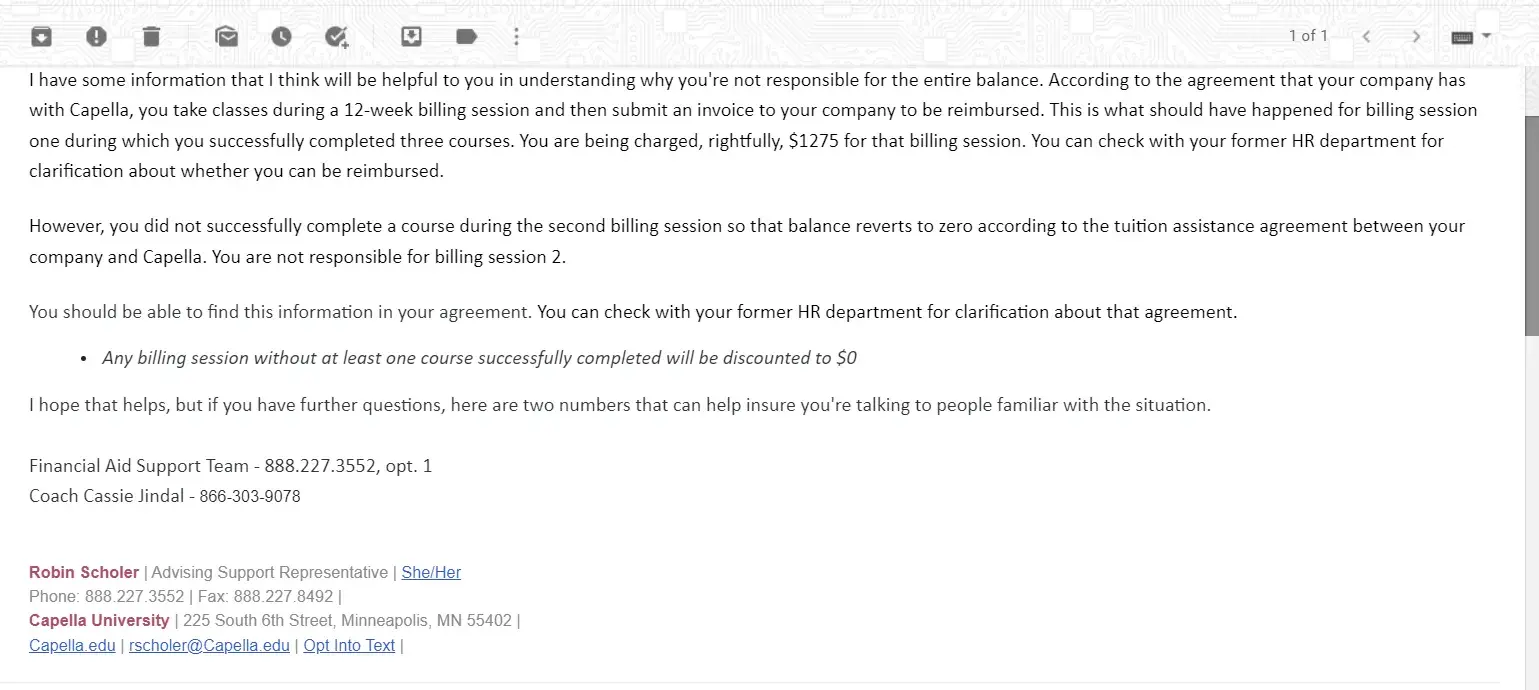 I eventually withdrew from the program altogether and was planning to pay off what I owe for the first billing cycle. However, the bill included the second billing cycle as well. After numerous phone calls, I received an email that confirmed that I was only expected to pay $1275 to satisfy what I owe. However, Capella refuses to adjust the bill; they insist that I pay $2,350, despite the fact that the second billing cycle was supposedly dropped to "$0" because I did not complete any courses.