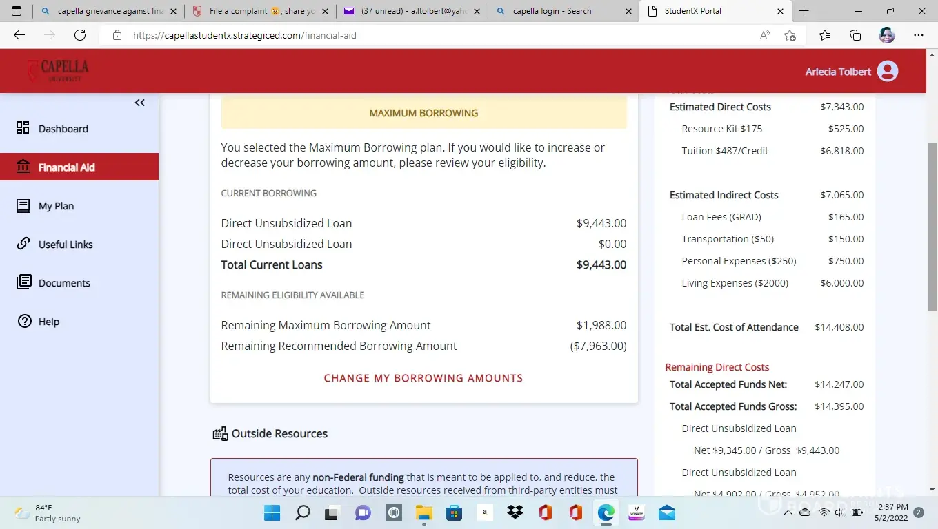 Desired outcome: Return to Capella completing my doctorate program without any issues and to have my 12500 grant disbursement to kick in for my classes.