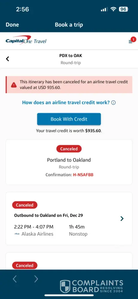 I had a $935 credit for Alaska Airlines as I needed to cancel my flights [PDX to OAK, Dec 29th - Dec 31st roundtrip]. When using the credits to book one-way tickets [Pdx to oak on dec 29th] for $134 each, they ended up charging me $428 for each ticket (I purchased 2). When asked by I didn't have $667 in credits to use.