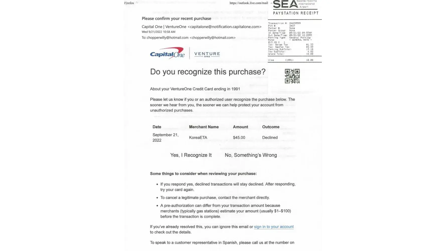 I had previously checked on your website site about travel notification needs, and it stated that it wasn't necessary to notify you about traveling overseas. Yet, my charge for $45 was declined as the merchant's name for the charge was: KOREAETA.