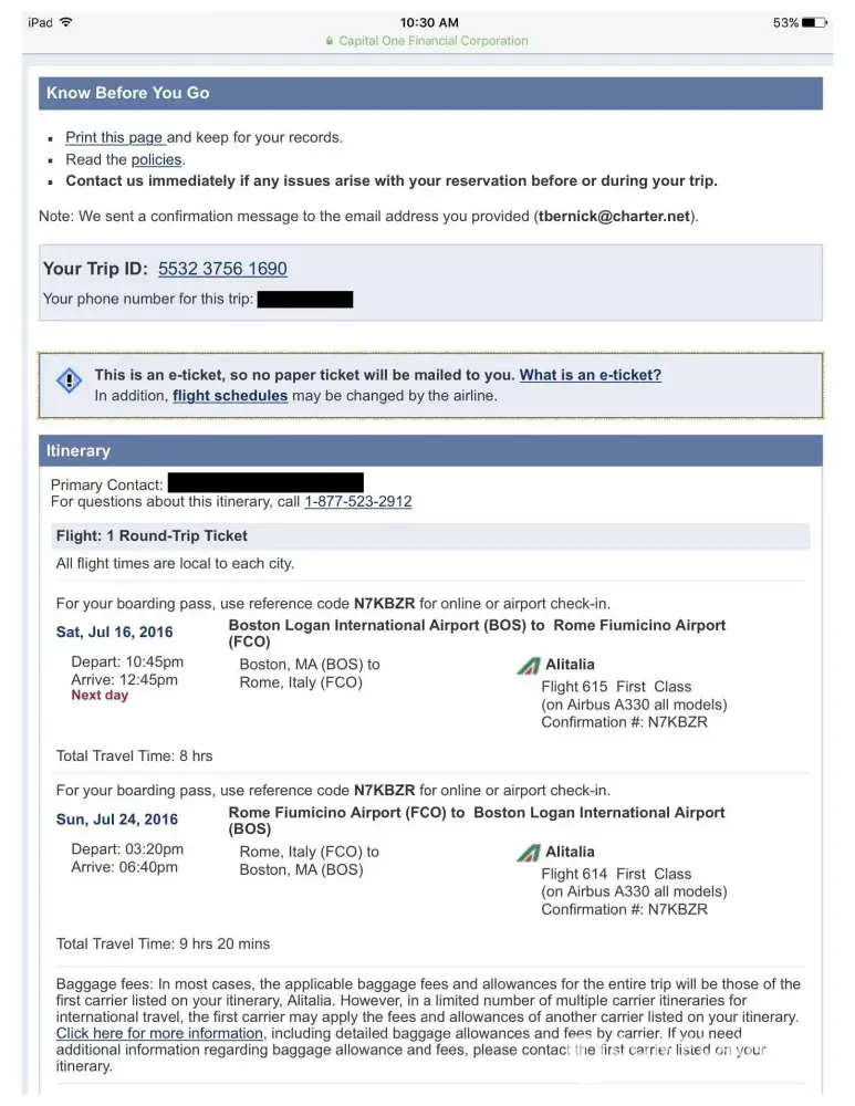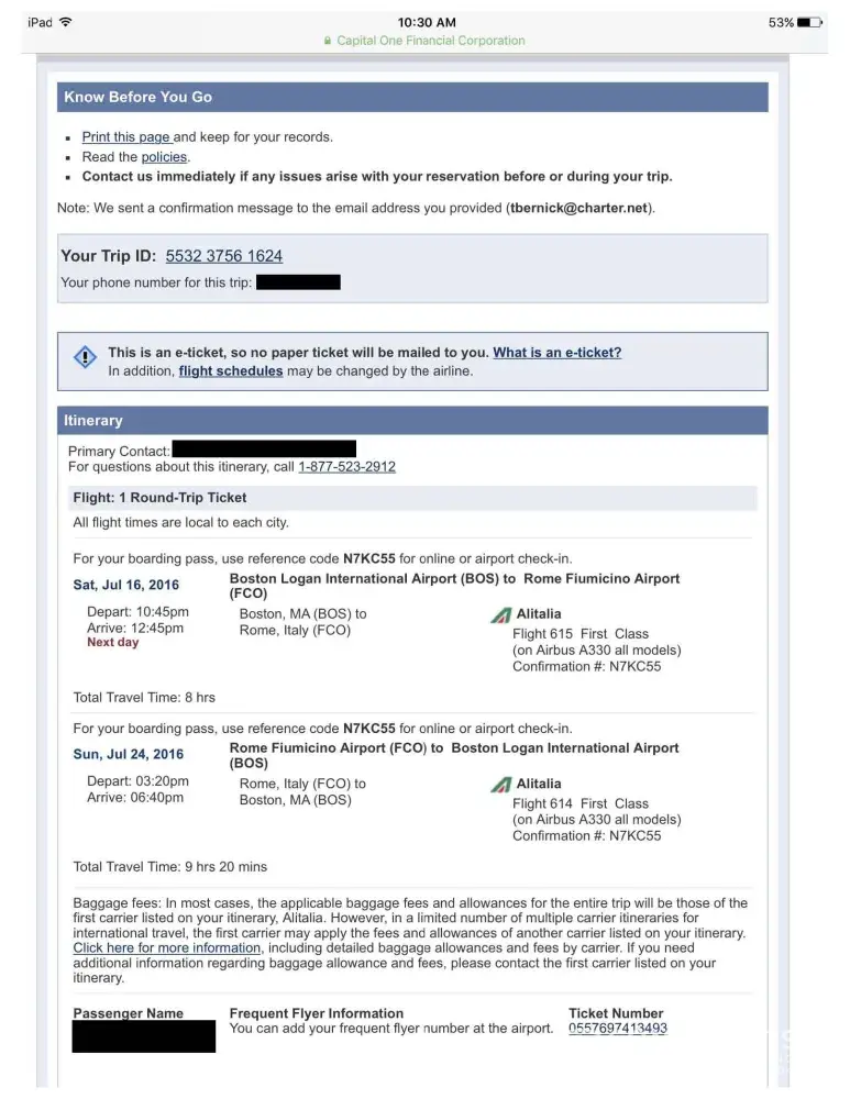 On November 1, 2015, I purchased two First Class, round trip tickets from Boston to Rome on Alitalia using the Capital One Rewards Travel website. The tickets were purchased as a birthday present for my wife, but our entire trip was ruined by Capital One’s fraudulent activity.