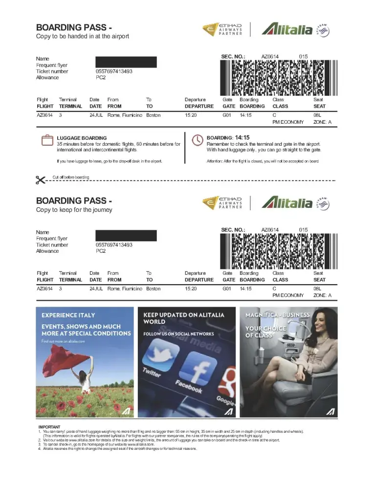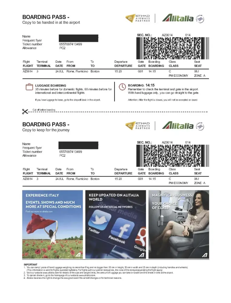 On Saturday, July 16, 2016, the day we were supposed to depart for Rome (after flying all the way across the country from Los Angeles to Boston), I tried to check into our flight. Once I reached the seat selection screen on Alitalia’s website, I was only given the option to select Premium Economy seats notwithstanding the fact that I clearly purchased First Class tickets as evidenced by the attached reservations from the Capital One Reward Travel website. I immediately called Alitalia to ask why I could not check into First Class, and they said the tickets in their reservation system showed up as Premium Economy, not First Class. The Alitalia agent said I would need to discuss the discrepancy with whomever I purchased the tickets from.