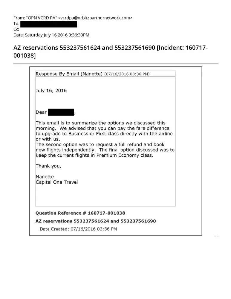 I immediately called the Capital One phone number listed on my reservation receipt and spoke with Nanette S., Agent Sign AOC in Wilkes-Barre, PA. I explained the problem and asked that she put us in First Class on the flight we were booked on, or the other direct Alitalia flight scheduled earlier that same day. After spending over an hour on the phone, Nanette told me that despite my reservations clearly stating that I purchased First Class tickets, there must have been a computer error and she could not do anything for me. I then asked to speak with a supervisor, and she refused. Nanette then proceeded to tell me that my only choices were to accept a refund or pay to upgrade my tickets from Premium Economy to First Class! I was in such disbelief that I put her on speaker phone and asked her to repeat this so everyone else in the room could hear her response. In addition, I asked her to put it in writing and have attached a copy of her email to me stating the same thing.