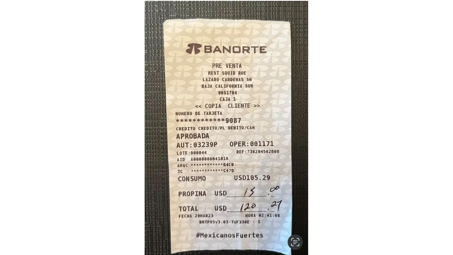 On the receipt I was given from the merchant you can see that I clearly left a $15.00 tip and wrote in a total of $120.29.