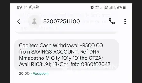 Large amounts of cash has been drawn from my Capitec account while I were inna different town and never drew cash in this town. I never received any notifications of the transactions as Im supposed to get.