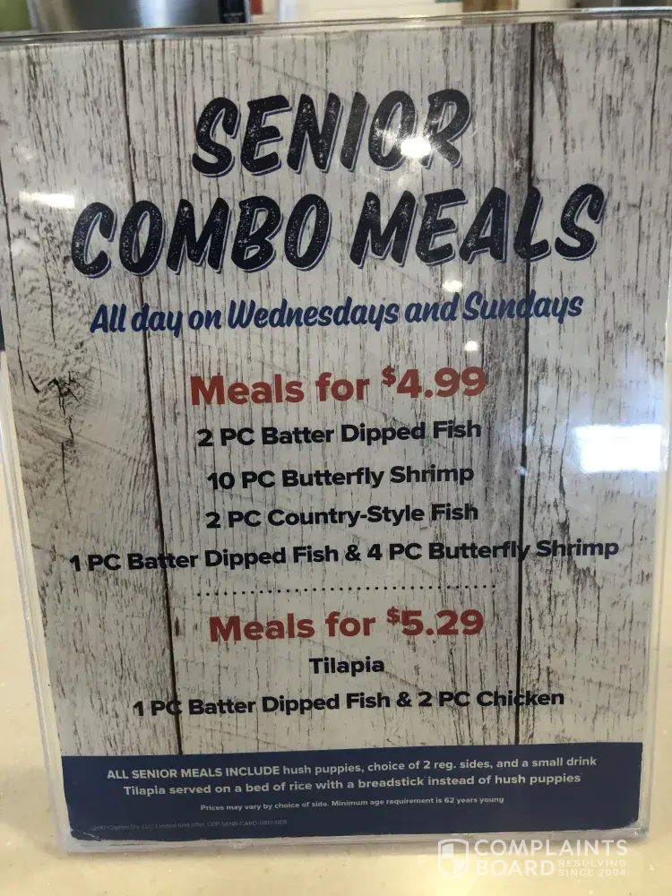 On Sunday October 13th I went into the Crestview Captain D's to buy my 84yr old mother lunch. My mother is on hospice and is unable to leave home so I asked if I could take picture of the senior menu. I took a picture and texted it to her and she texted me back what she wanted. When I ordered, they told me I could not get her senior discount since she...