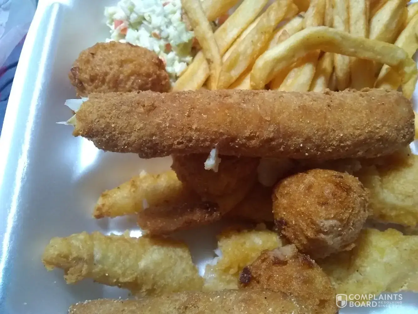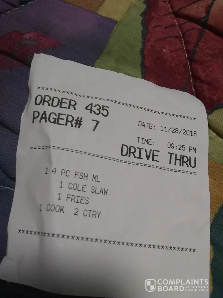We had to wait about 15minutes in line. When I got to the window it was another 5 minutes. Because I was driving I couldn't look at what I had. I ordered a 3pc fish dinner and when I got home I had a shrimp & fish meal deal. My fish was wet because cole slaw was literally all over everything. I'm so upset because I was at home when I discovered what was in my plate about 35 miles from there.