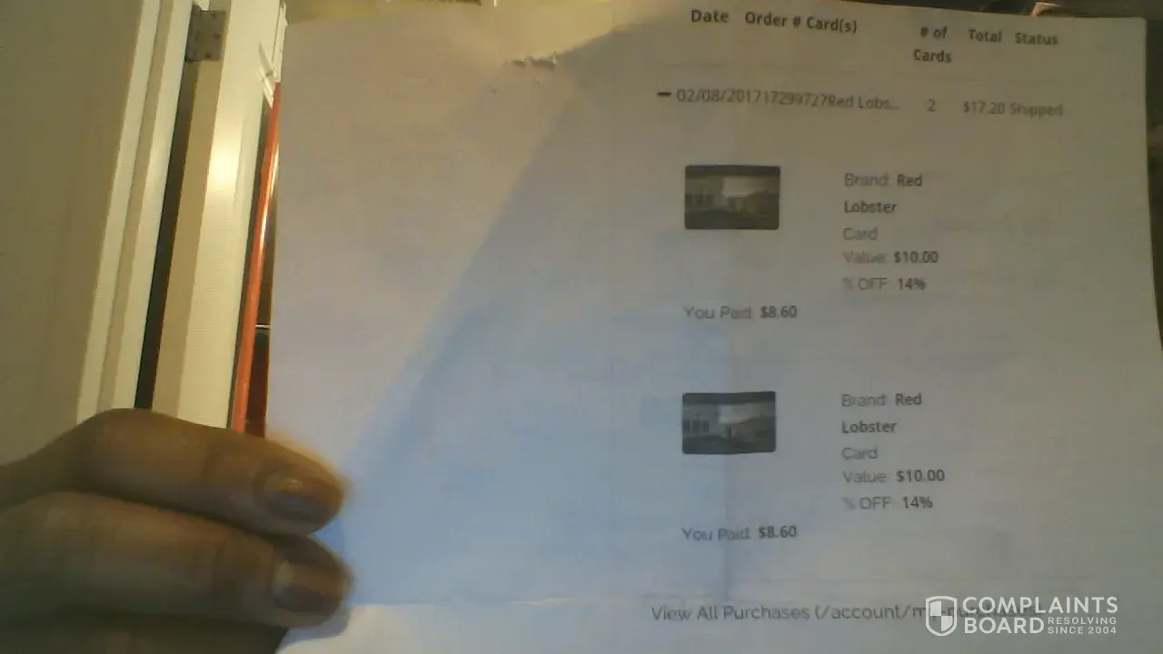 On February 8, 2017, I bought two Red Lobster cards and gave them as a gift. Spoke to one of the person(s) recently and was told she did not use it because she thought they were BOGUS. The total cost was $17.20. My request is that you please look up the cards and resend them to me so I may use them.
