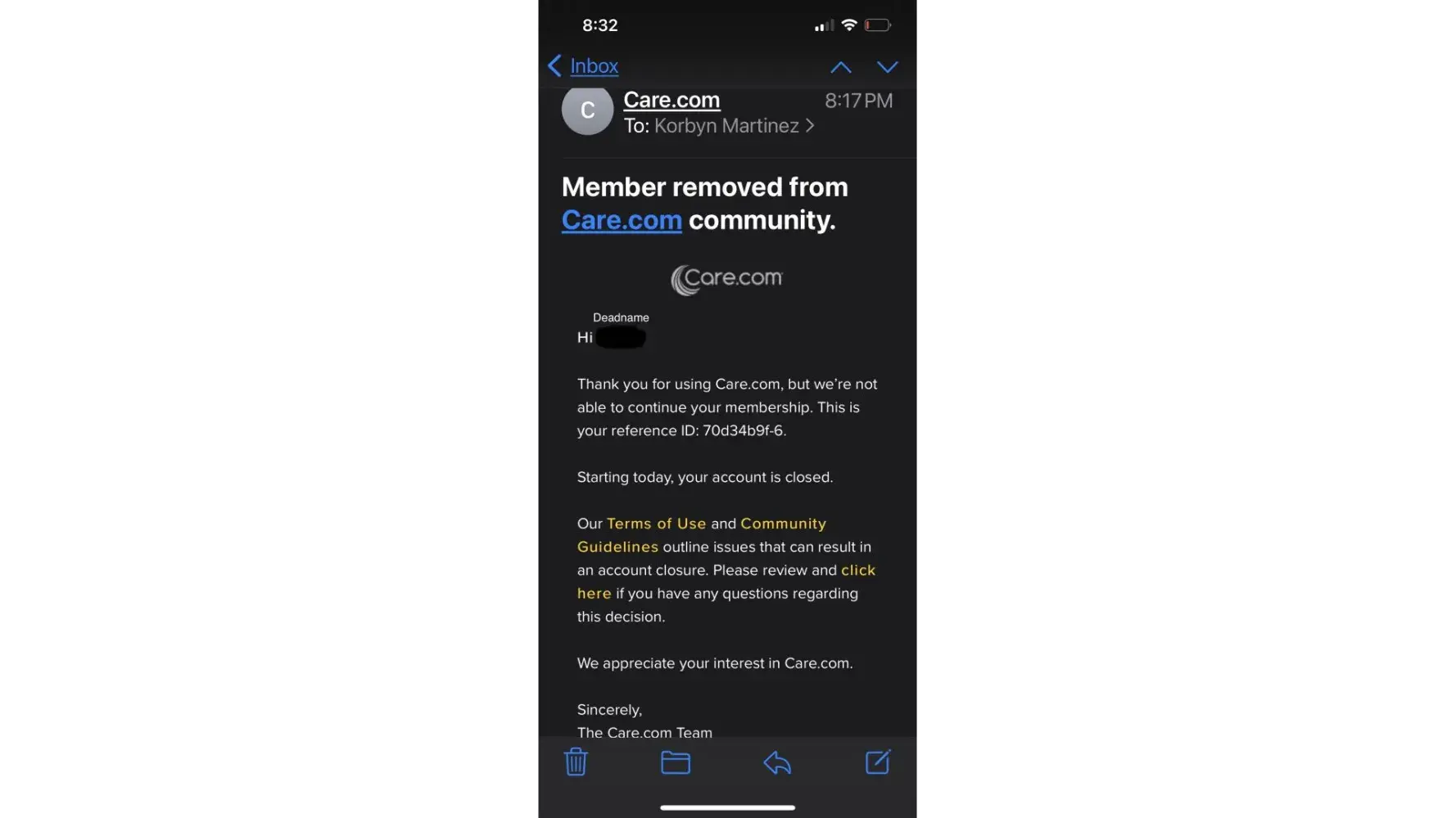 Yesterday, July 11th, I signed up for care.com. Everything was going amazing until I got a notification saying that my account had been terminated. The only thing that happened before this was my attempt to change my preferred name. My legal name was all the same, but I entered in my preferred name, Korbyn, and suddenly, termination. I didn't realize being trans was grounds for denying me a job. Hours before the name change, I attempted to edit my description. I added something to the effect of this; Though I identify as a man, my voice and body type often lead younger kids to refer to me as "she." This isn't a problem at all, and I won't correct your kiddos. I completely understand and wouldn't want to confuse them. I clicked "confirm" and waited for approval; it never came. Instead I was terminated. If you're trans of non-binary, save yourself the heartbreak and stress and don't give these people any money. I paid 20 dollars for their stupid background check, only to be met with this.