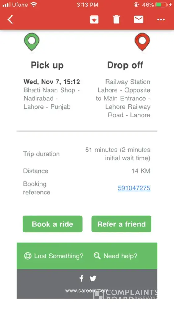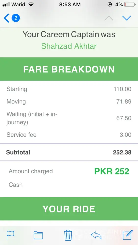 complaint against careem captain mr. mudassar awais, go mini, grey mehran go, leh-8943 lahore