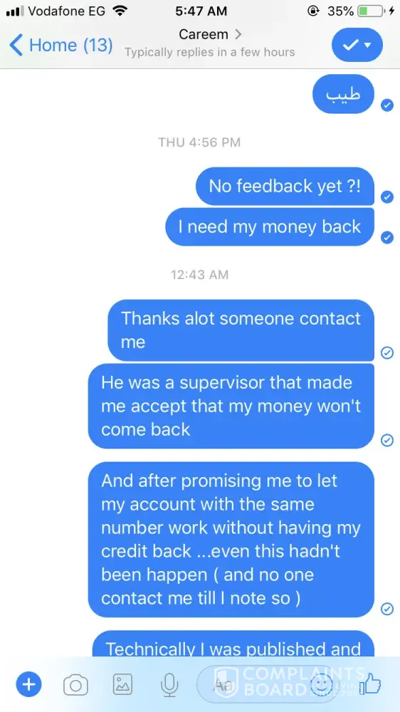 And the second handle me in order to accept that my money had gone and I won't have any kind of refund and he promised me that my account will be recovered ( without my credit) as I am an old customer who made more than 250 trip with this Company that supposed to be respectable company, and after that my account wasn't came back