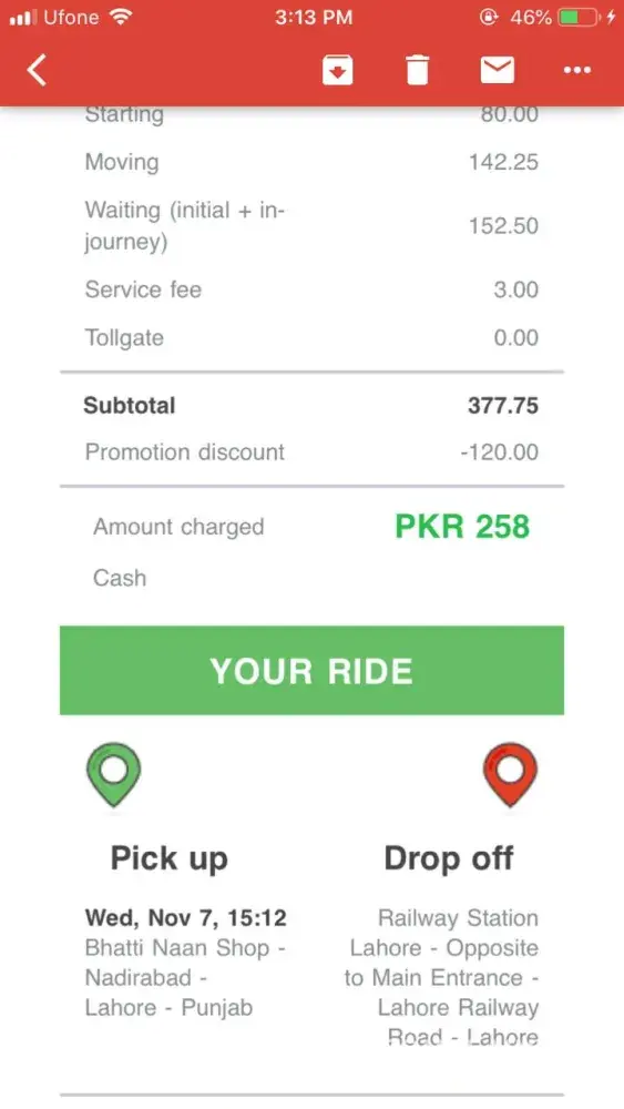 I used cAreem service GO today and received a Bill at my email. Which is as under.
