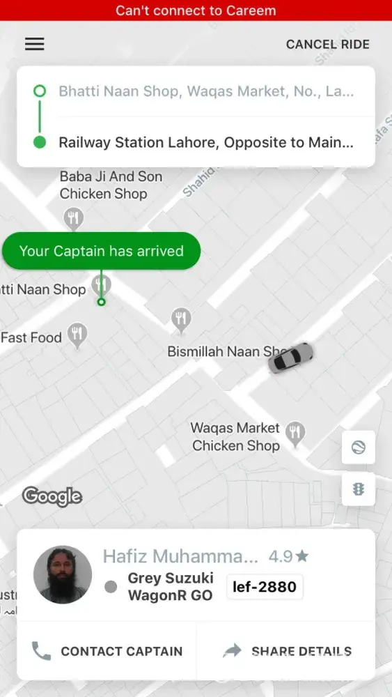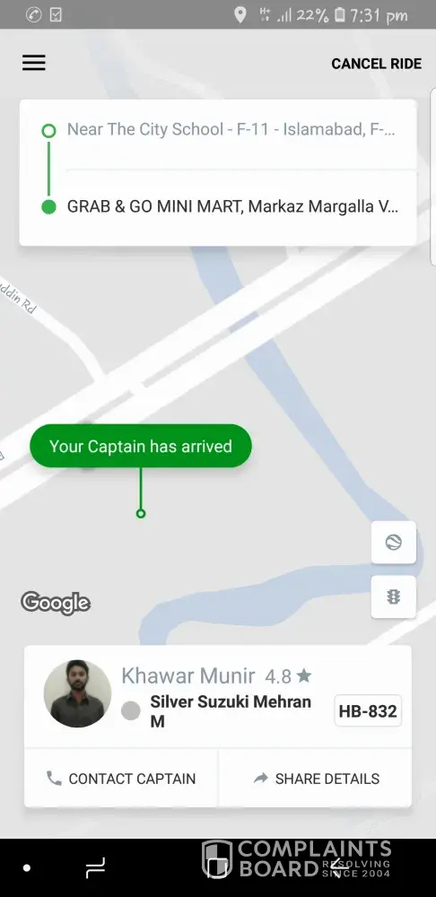 I booked a ride toward rawalpindi fawara chowk and the captain told me that he is coming i waited for him and he showed that he has arrived at my pick up.point but he was far away from my location i called him to come at the right location but he misbehaved and cancelled my ride after 10 min and careem charged ...white suzuki alto vs 529...