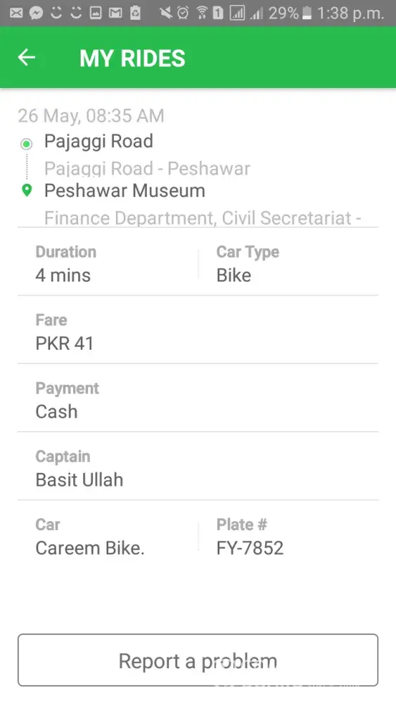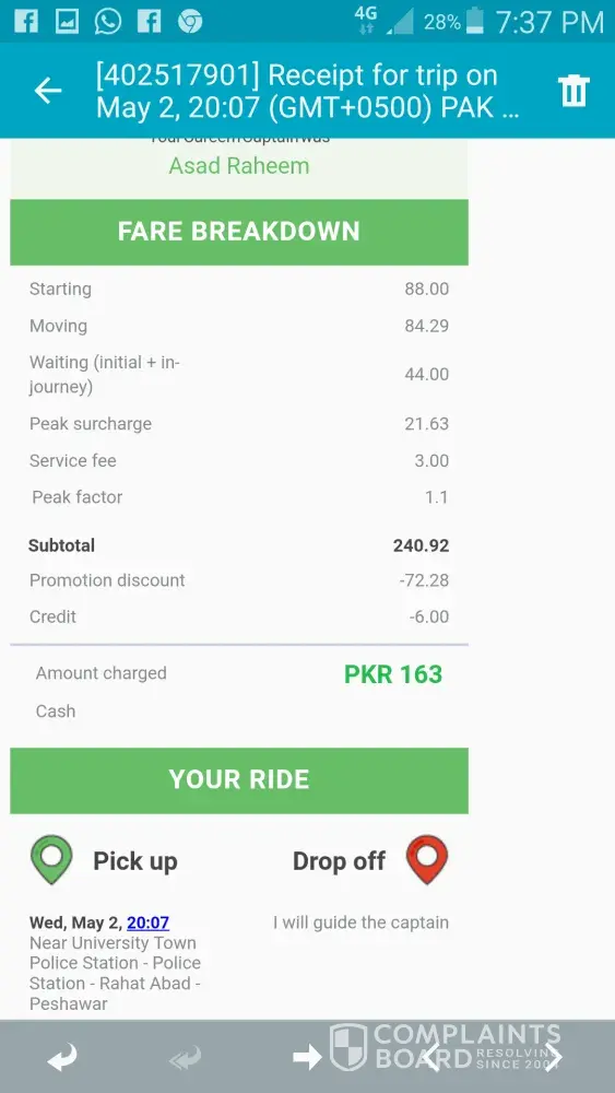 sir ma na peshwer ma ride ke hy... mujh agriculture university peshwer sa MPA hostel jana tha .. sir captain na mujh sa ak time py 2 rides le. or rasta rasta ma us ki ghadi band ho jati thii .. ma na yah sub kuch compromise kiya q k mera sth family member thy.. or mujh mpa hostel jana tha jo k sadar sa tohra ahgy hy lakin captain na mujh adah rasta py uthar liya.. phr udhr sa ma na raksha kiya usa b 120 rupy da kr apni distination tk pohnch.. its not behave good. sir 250rs estimate tha or us na mujh sa takreeban 300rs liya... sir ma cream ka regular customer hun.. or mujh bahrii afsos sa yah khana phr rha hy k us k bd ma na cream ki service ko unstall kr diya.. or ma ap local texi ka istamal krta hun.. jb tk mujh yah piasa vps nhi hota ma cream use nhi kru ga.. thanks.. think about it.. agr esa ap k sth ho jay to ap kiya kry gy...