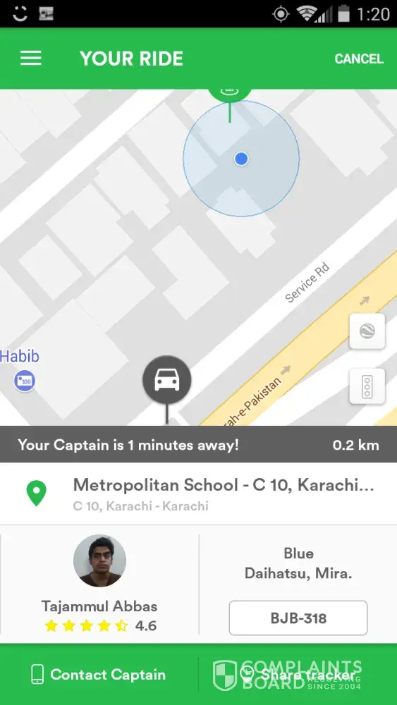This complaint is about the Careem Captain Tajammul Abbas having car Blue Daihatsu Mira, Registration # BJB 318 and the cellular # [protected].