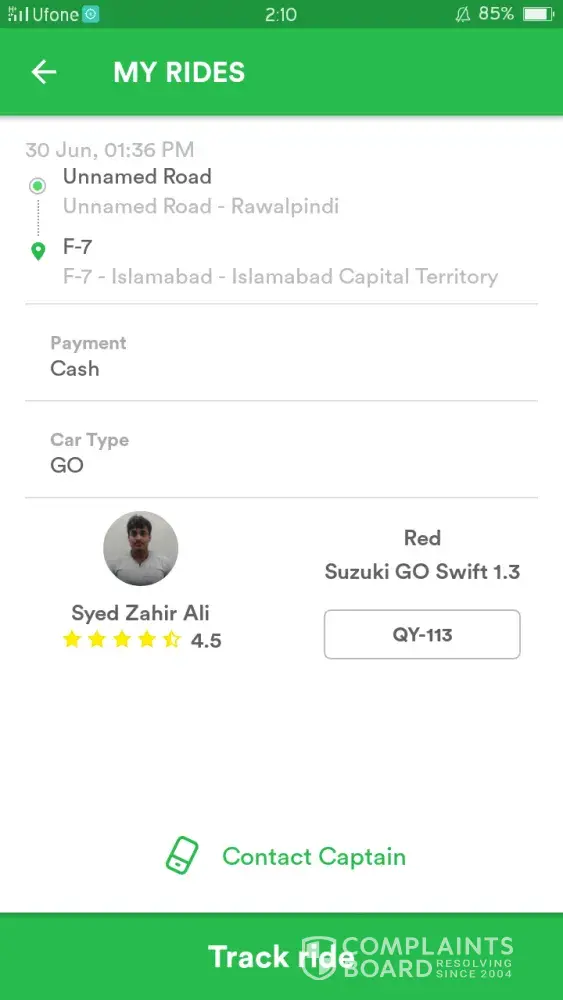I booked a ride fromairport society rawalpindi at around 1.30 on 30 june 2017. The captain was syed zahir ali, car was red suzuki go swift 1.3 with registration no. QY-113. The driver started the ride before reaching at my place. I waited for him for 10 to 15 minutes after he atarted ride himself and my bill was being counted. The screen of my phone showed u will reach destination in 31 minutes and so on...upon asking he said that happens automatically by careem app and he charged me extra... No one picked call on hwlpline either and even the captain didnt attend ny call fir first 10 minutes...he was ridiculous take strict action. I need a reply of my complaint forom u