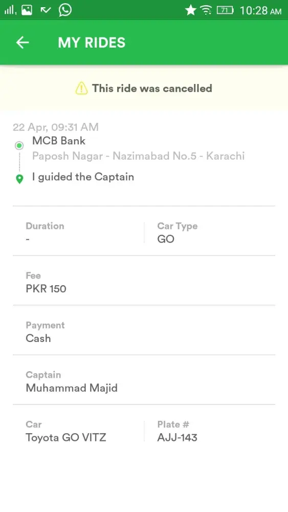 Plate# AJJ 143 Captain name Muhammad Majid. I guided him he came some where near my house I spoke to him on Phone and guided him he was just 1 minute away and very near to my house in Nazimabad No. 5 Karachi. But when after few minutes he doesn't came I start calling him and he was continuously disconnecting my call and after few minutes I received message that your ride has been cancelled by captain.