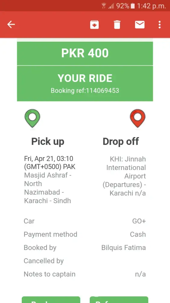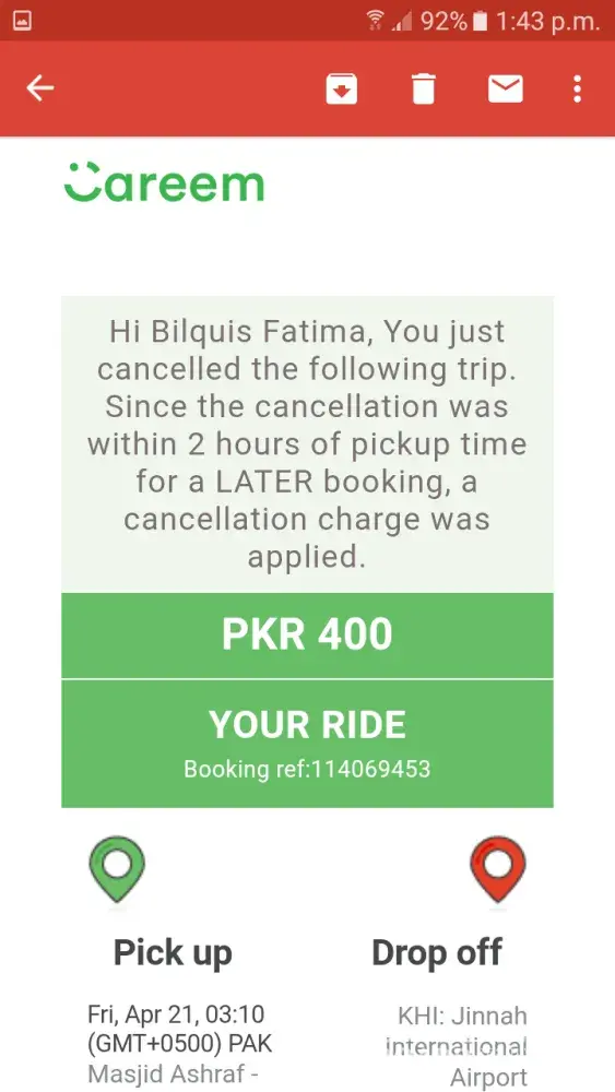 My name is Shoaib Zubairi and I am a student. I booked a Careem on 23rd April from Emporium Mall to Greenhall Academy Johar Town via "Ride Later" option. My captain was Adnan Bashir and my car was a Black Honda City. Plate# LWN 0450. GO+ class was selected. The captain accidentally cancelled my booking because his phone wasn't responding. Today I opened the app and had 400 PKR in negative balance. An e-mail was also sent by Careem saying that "I" cancelled the booking which is indeed false, the captain did while I was in the car. I paid 150 PKR for only travelling 1km. Hoping to get a positive balance, I got a negative balance of 400 PKR. Please fix this. Thanks in advance