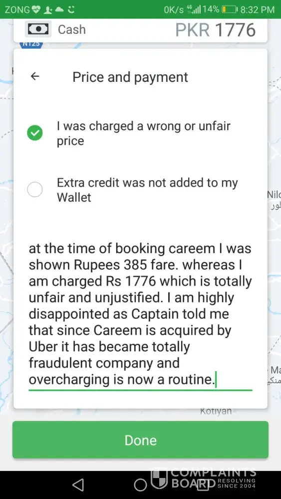 Today I booked white alto suzuki mehran number 1605. Name of captain I didn't remember but his mobile number was 03039840959. My estimated fare was 275-330pkr.. On the way he adopted speed of 80 or 90 & no signals stop even or traffic jams. But when we reached he showed fare of 820pkr & took 850pkr. When I asked why he said its peak charges. Which was 1.1 & its go mini.. Its 2.39pm & I reached office at 10.10am. No bill or no sms regarding ride I received yet. & unable to understand how come he charged that much high fare..