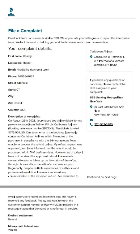 Thank you for your prompt attention to this matter. I trust that Caribbean Airlines will take the necessary steps to address and rectify the issues raised.