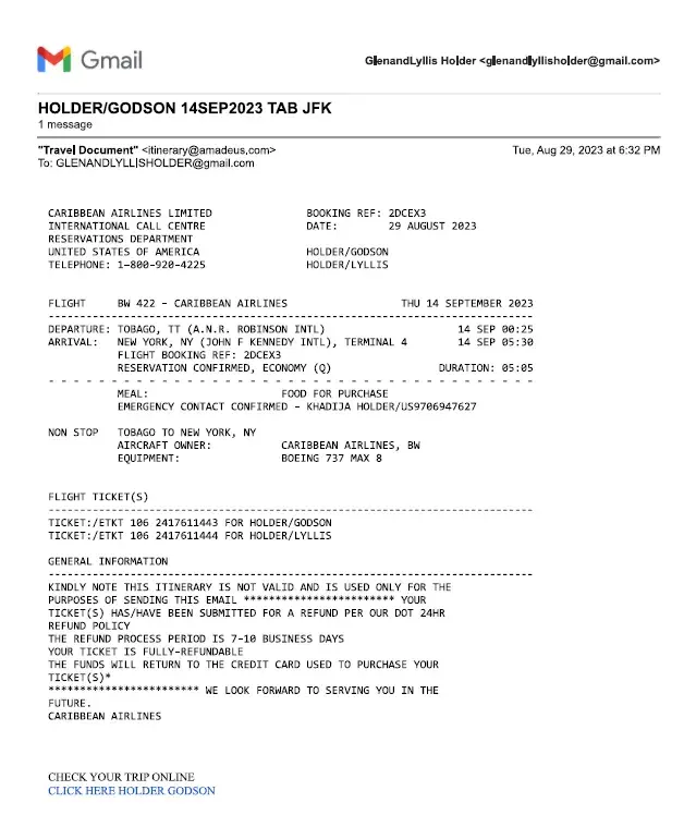 Caribbean Airlines Cancelled Flight BW005 (April 26,2023) Booking Reference #: 4SEACN