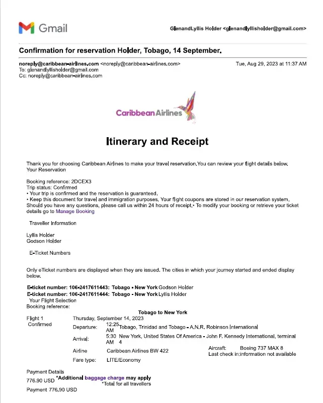 (5) Unfortunately, her targeting me did not conclude here; when I arrived at Piarco, the only suitcase that went missing was mine. Imagine she was able to block my suitcase as well! I had to wait two days after I arrived in Trinidad for them to deliver my suitcase to the hotel. I had to be confronted with additional expenses to buy clothes and basic amenities for two days before I received my luggage from Caribbean Airlines. This expenses was an additional Can $800.00 (funds that I did not have).