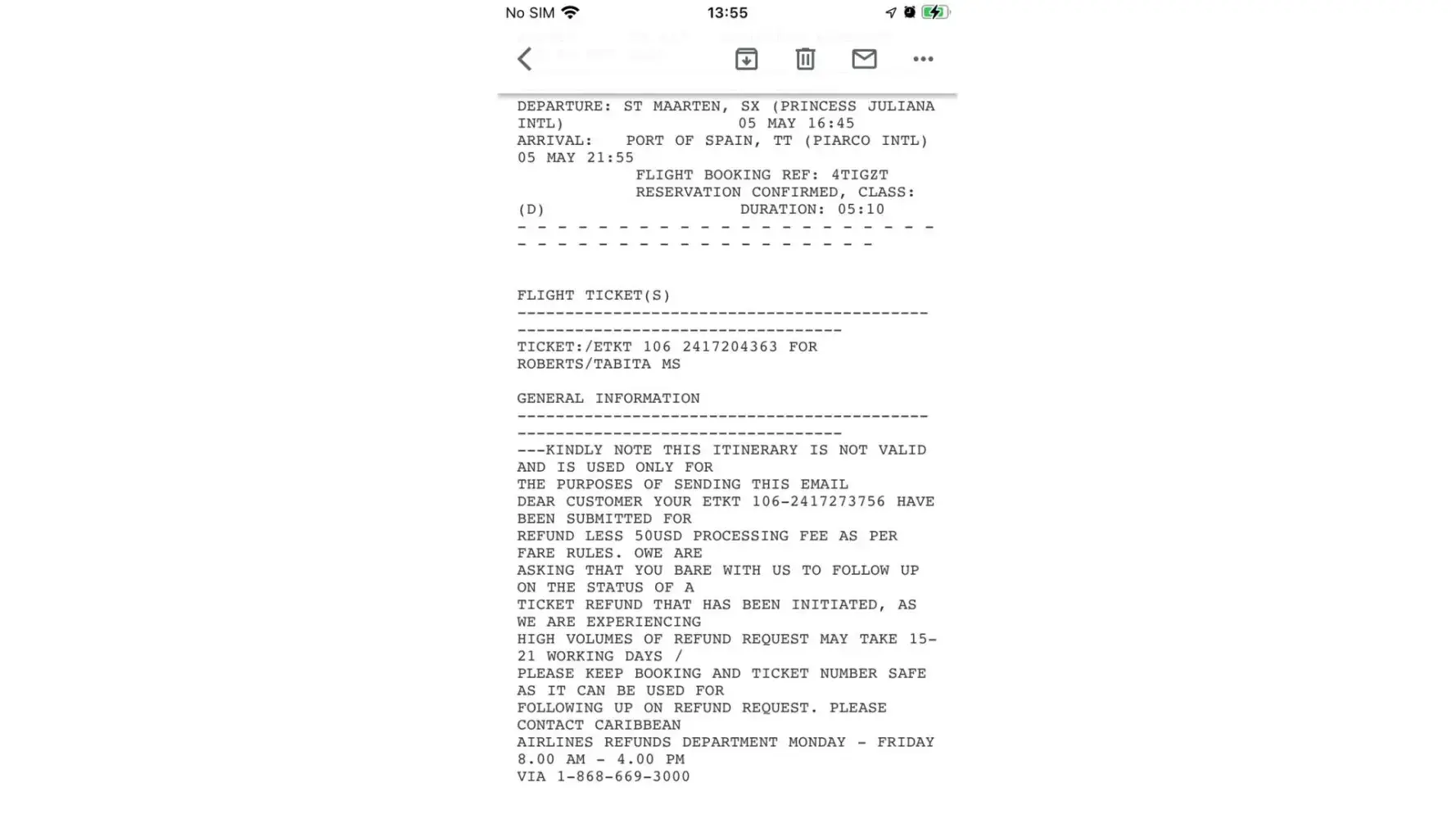 I purchased a one-way ticket from Trinidad to Tobago on May 28th, 2023, flight date, Sunday June 4th, 2023. On June 1st, 2023, due to extenuating circumstances I called CAL and requested a refund to which I agreed to the terms and conditions.