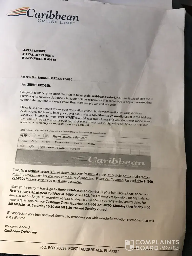 Also sending letter to BBB and express mail certified to : Caribbean Cruise Lines