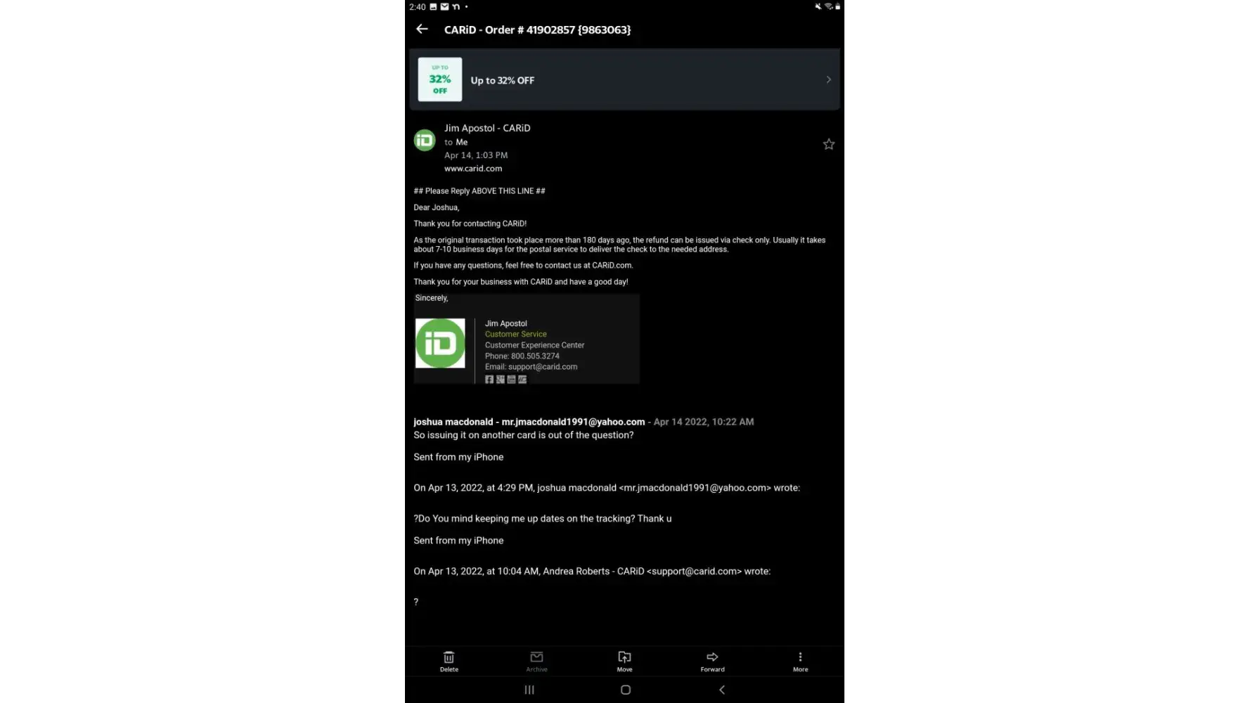 This is getting to the point of insanity and I’m very fed up with carid amd I'm getting very angry at the lack of response and professionalsism of caid. I paid you guys $1,600 June 2021 for a carbon fiber Zl1 wing by Anderson composites. You guys always waiting till the day you said I would receive it to inform me that it’s been put on back order again . After 5-6 back orders you guys then told me the expected ship date cannot be deters this time .Then I ask for a refund and it’s been 180 days so you can’t refund my card but that’s not my fault that’s yours so I don’t see why you can’t make an exception to that’s policy considering it was your fault and you have been holding my $1,600 hostage for a year now . That is not acceptable and I will file a claim against you , report you to The better business bureaua . You claim to have mailed my refund check on April 14th , was told by one of you that it would take 3-5 business days ,another told me 7-10, I even called and they told me last Friday at the latest .Everytime I reach out you guys tell me 24-48 hours you’ll contact me but never do . I’m very fed up and I will get legal if I don’t get my money back in a day or two . No excuse for this