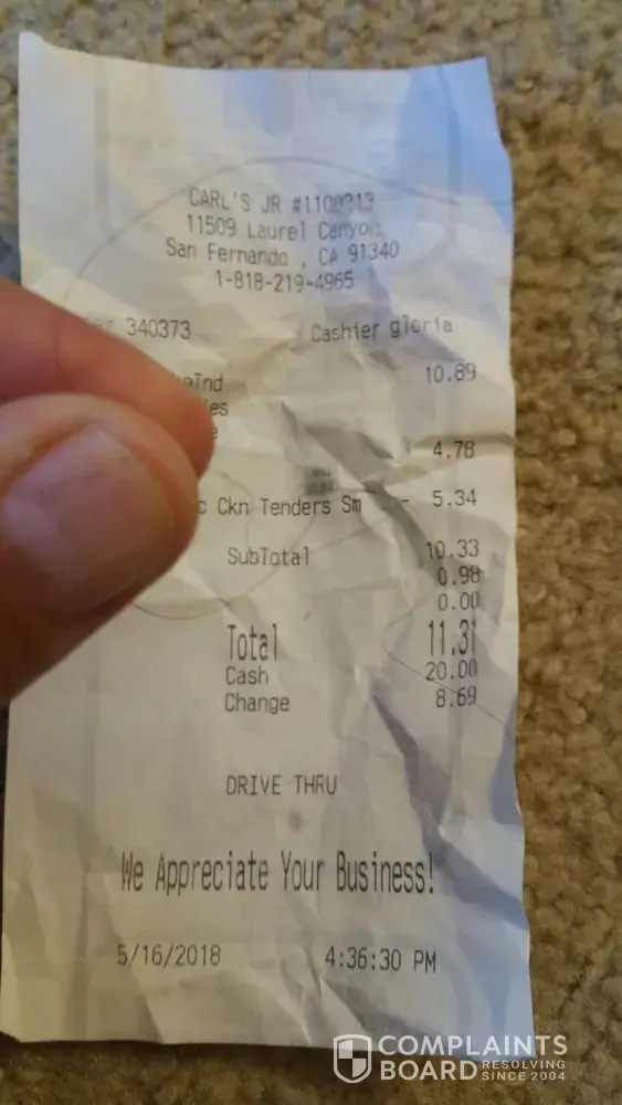 A couple of weeks ago I purchased food from the Carl's Junior located at 11509 laurel canyon in San Fernandina Valley, Ca,