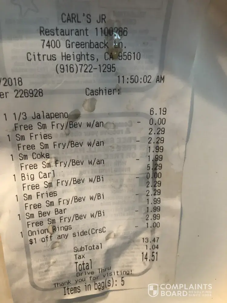 Fries were not cooked fully, onion rings were overcooked almost burnt and happy burger was not fresh. Had to throw away not worth eating didn't look good at all. Jo-Ann an employee serve that to a customer and be charged. I live too far to go back. I should have checked my food. I will not be going to Carl's Jr anymore. How many times has this happened to customers. Very unacceptable to me. For what we pay I would think they should get the order right.