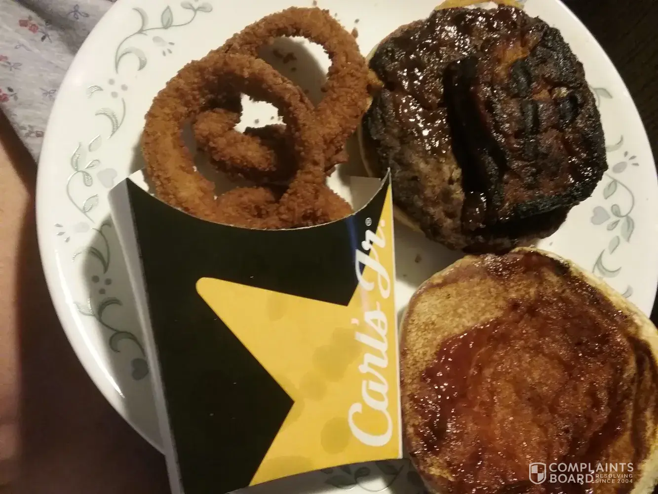 On June 30, 2017, my husband and daughter went to carls Jr 1100729, in Yucca Valley, CA and placed a order to go. Which included the new baby back burger meal. Along with other items and drinks. It looked so good on the TV that my husband went to two restaurants, since he doesn't like BBQ sauce or carls jr, so I could have that burger. They waited 20 minutes to get the food. When they got home I was so disappointed. When did it become policy to burn everything they serve. My husband said he will never go back.
