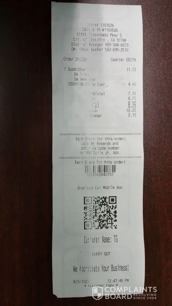 Desired outcome: something needs to be done with your customer service. they were rude and not helpful at all. I want something done so that the next time i go to Carl's jr I want free food and treated with respect