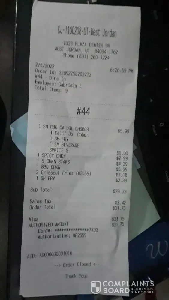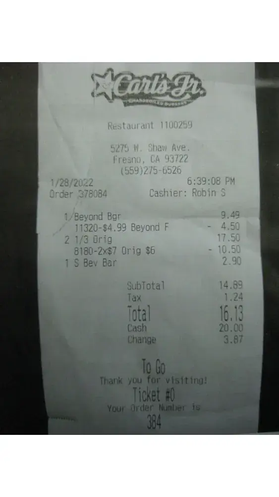 On 1/28/2022, at 6:39:08, I went to Carl's Jr restaurant #1100259 to purchase a 2 for $7 original charbroiled thickburger. Order 378084. ticket #0, and order #384. When the cashier, Robin S., gave me the receipt I noticed that it didn't reflect a 2 for $7 purchase anywhere, the amounts did not match the coupon. She stated that those are very expensive burgers and that was the price. I chose not to argue with her and to address the situation in this manner. I've attached a copy of the receipt which would show why I question the transaction. My email is [protected]@sbcglobal.net if you have any questions. Thank you