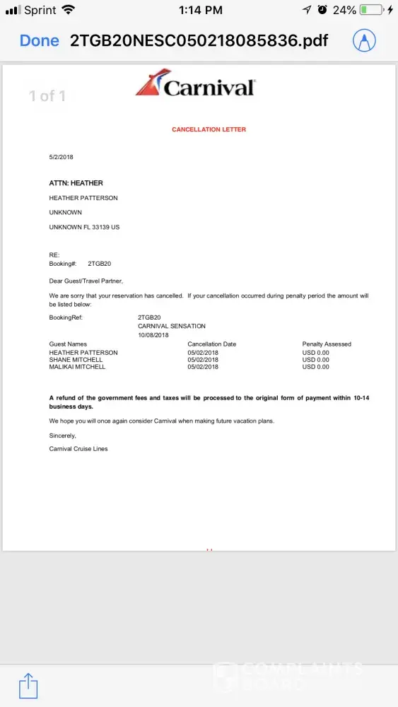 We still as a group wish to eventually take the 5-day cruise stated above, perhaps later using the funds intended for this trip. We ask to be given the chance to make right this missed opportunity to sail THE FUN SHIP.