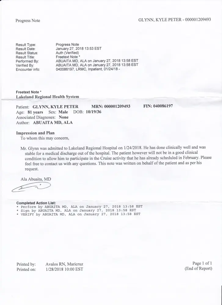 My wife Christi and I were to cruise on the Elation, departing from Jacksonville FL on 27 January 2018 (booking#9JJ3N4~Stateroom M242~VIFP [protected]) with our friends Jerry and Mary Lou Igo. On Monday January 22nd, I was scheduled for an emergency Diagnostic Cardiac catheterization / Angiography at Mayo Clinic, for chest pain. I was hospitalized immediately after completion, based on results of the completed Angio. I was the first surgical case for Tuesday 23rd, for a quintuple by-pass (CABG) of my coronary arteries. I was hospitalized through Tuesday Jan 30th and sent home for 6. weeks of recuperation. Our friends went on the cruise as planned.