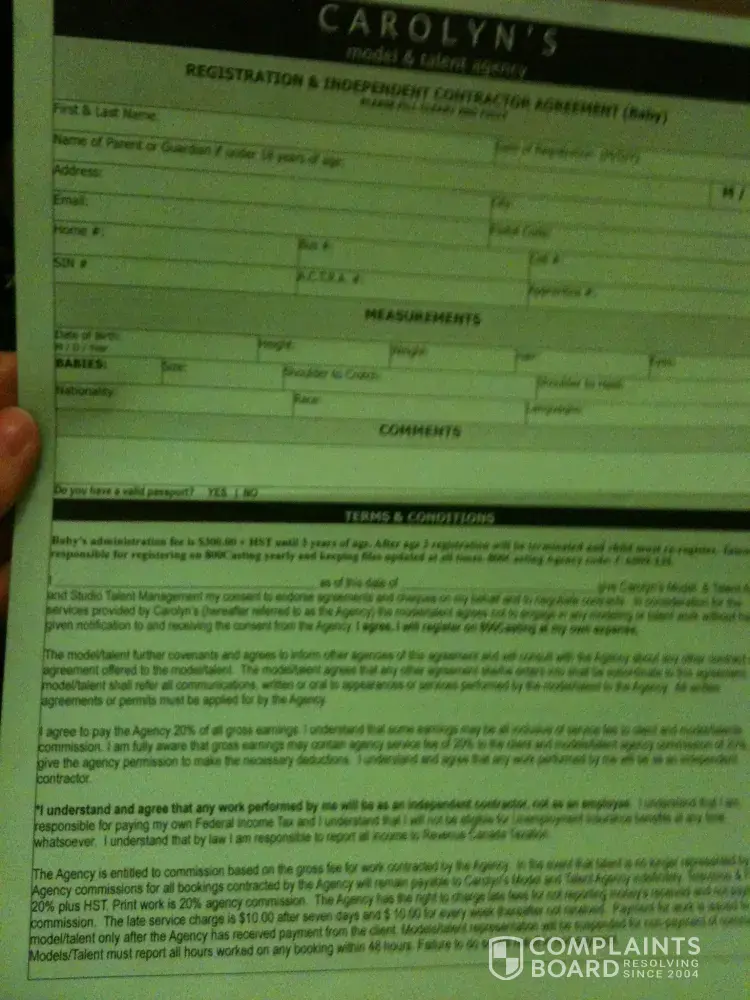 This Agency is a SCAM! We went in for the open call for babies at the Mississauga location, which second address to the downtown Toronto location. We were told to be there at 1:00PM SHARP! We arrived on time. The building was very shabby and that raised a red flag immediately. There were around 25 babies sitting in the room, and I want to add that they were all beautiful. I was really impressed by the turn out. By that time the meeting began, thirty minutes late, the babies were restless, crying, and tired. A woman spoke for fifteen minutes and gave a great first impression. She never mentioned that there was a registration fee. If they had been up front, I would have never gone. After she was done talking, she pointed to a second room to sign up and have your baby registered. When we got into the room, I was told that we need to give our baby's measurements and a check for $300 dollars. What? I asked what and who the money was for. I was told by a blond woman that the money was what paid the bills at the agency. I replied that the agency was suppose to make money off the bookings. I explained that I Ford and Elite Models do not charge their models to represent them. The blond woman replied, "Yeah, but does Ford Models even exist today?" I was so shocked that I couldn't say anything. One of the other women in the room replied that Ford Models is one of the best and oldest agencies in the world. On top of that, I was not allowed to leave the room to review the contract, a contract that required a 3 year commitment. I just have to say the people were very nice, but this is a business. A business not in the best interest of the models. Read the contract for yourself. Do you want to pay $200 if you show up late or miss a booking? That is not a normal business practice. It's too bad that I saw so many naive people paying out for services they will never receive. Good luck to you, and buyer beware! Carolyn's Agency is a fraud.
