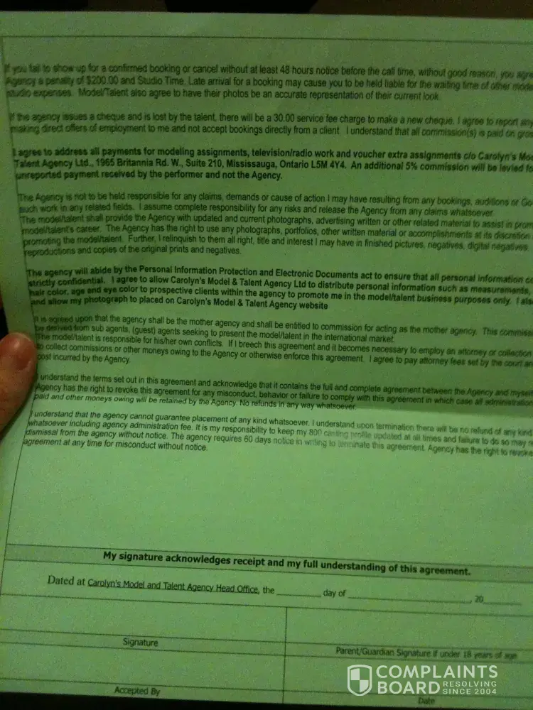 We signed a contract with Carolyn's Model & Talent Agency last year for my daughter. Basically we paid for pictures from their photographer. The pictures were horrible not even worth a $ 100 but we paid around $ 600. A similar thing happened with a friend of mine she paid the same amount for her daughter and some more money for the cosmetic products she was told to but for her daughter which supposedly you can only buy from Carolyn's.