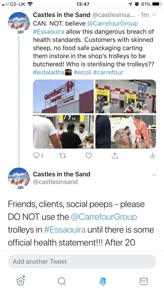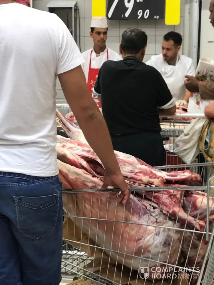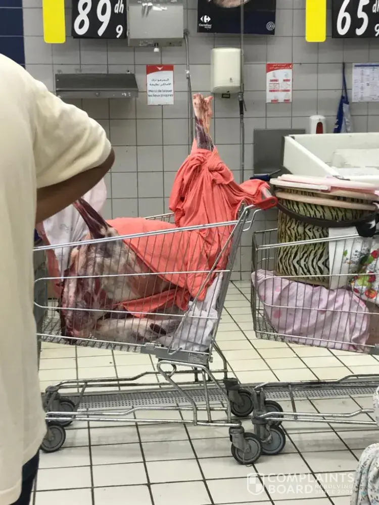 As an expat of 20 years and regular local to this store I am absolutely disgusted at the lack of any hygiene standards. I visited the store today to find customers using the store's carts to wheel in sheep they had slaughtered for Eid Al Adha for the store butcher to cut up. As you will see in the photos, raw dead animals are in the carts - this is a dangerous risk to all customers for ecoli and other potential food poisoning. This is absolutely disgusting. I have warned all friends, family and clients on my social media networks to avoid your store's trolleys until you have made a public announcement on how you intend to sanitise the store.