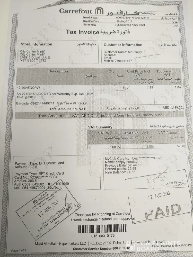 Please note I have purchased 49inch Hisense TV from Carrefour Mirdiff City Centre, Dubai, UAE on 12th Aug, 2019 and I have taken from store my self at home found screen is damaged.