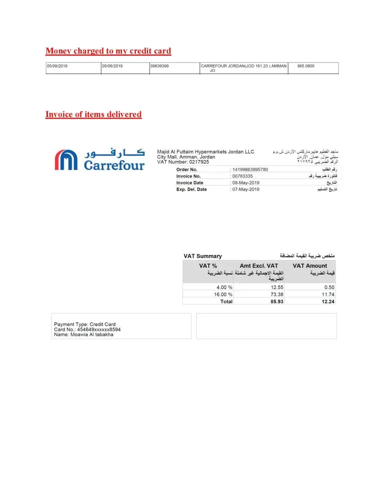 I made online shopping back on May 6, 2019, from carrefour - city mall (Amman) for the amount of JD 161.23. The delivered items were for the amount of JD 98.17 (difference of JD 63.06), but I was charged the full amount of JD 161.23. I live in UAE and when I was in Jordan I contacted Carrefour head office at city mall with a lady called Wa'ad. I had to go several times there and talk to her during my summer vacation. I have called her as well. She does not respond to me and my money was not returned to my credit card. My order No. [protected].