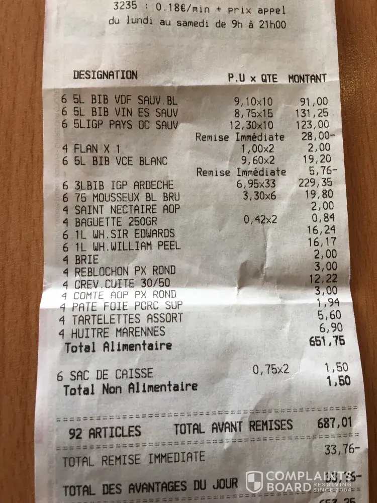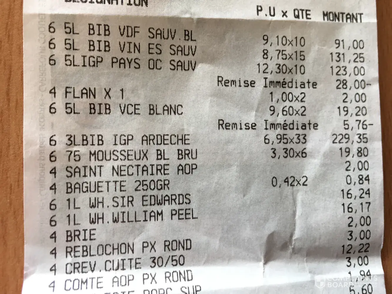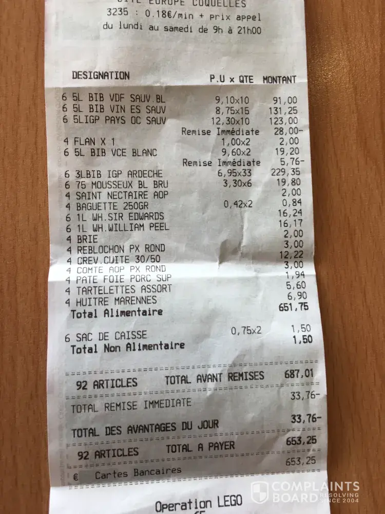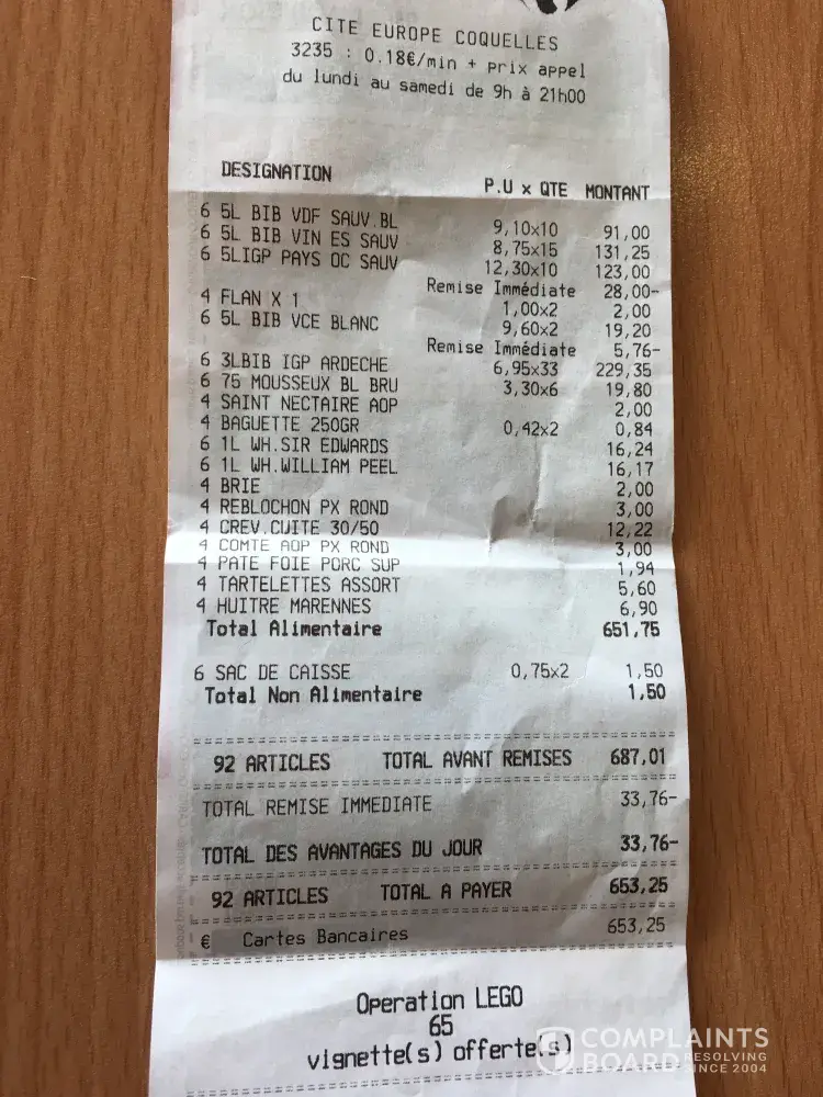 I live in the UK and have travelled to France today for wine shopping. We normally stock up about twice a year and purchase a large quantity of wine. On the return ferry I commented to my partner that the cost was very high this time and When examining my receipt/bill I noticed a mistake and that I have been charged for 33 boxes of one particular wine instead of the 3 that I wanted to trial, making an overpayment of just over 200 euros on my credit card. I am now back in England and unable to return to Cite Europe. I do hope you can help rectify this mistake and I am sure your stock control can identify that you have a surplus of 30 boxes of the wine (3L Ardeche). I look forward to hearing from you.