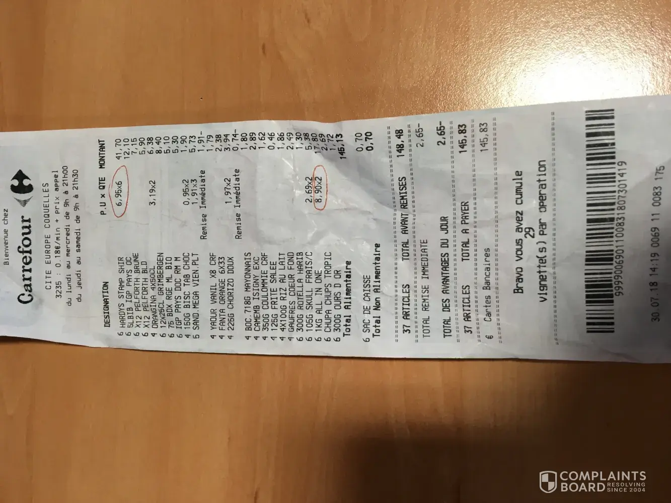 yesterday 30th July I visited the Carrefour at Calais in France and purchased 145.83 Euros worth of food shopping. We immediately boarded the Eurotunnel where upon checking the receipt I found that we have been overcharged for a few items. the 6 Hardys Stamp Rose wine was NOT advertised on the shelf at 6, 95 it was around 4 I believe, and also the 1kg All in one sweets were NOT advertised on the shelf at 8, 90, we bought 2 of these which the shelf stated they were around 4 euros. As we have now returned to the UK we cannot of course go back to the store, please can you help me resolve this online?