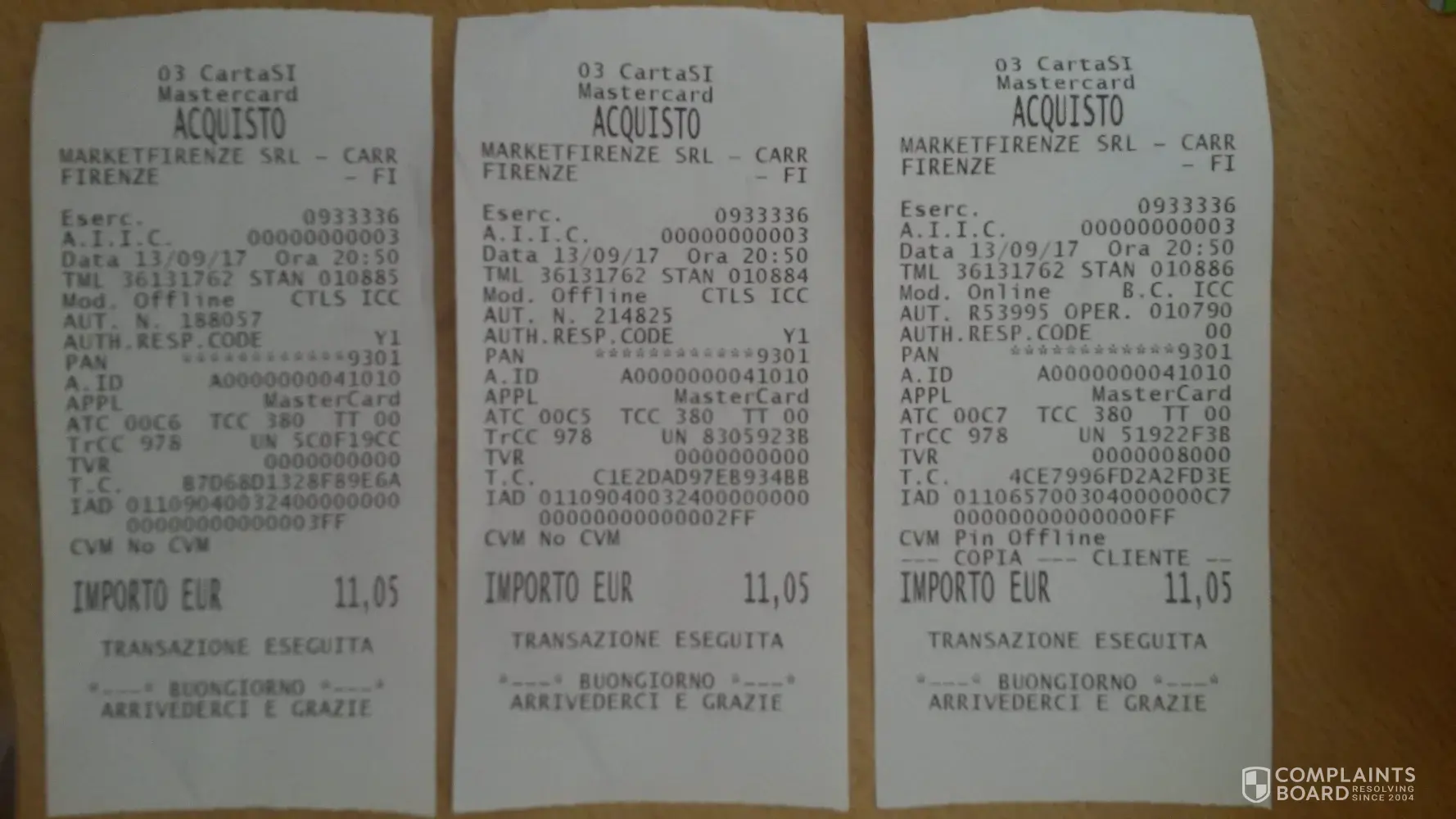 On 13 Nov 2017 20:50 in the Carrefour Express Via Santa Caterina Da Siena, 1 H, 50123 Firenze, Italy I was charged on my credit card three times for the same bill. The cashier actually tried twice contactless and said it had not worked. The third time using a pin code she said it had worked. I supply photos of the bill and the three credit card receipts.