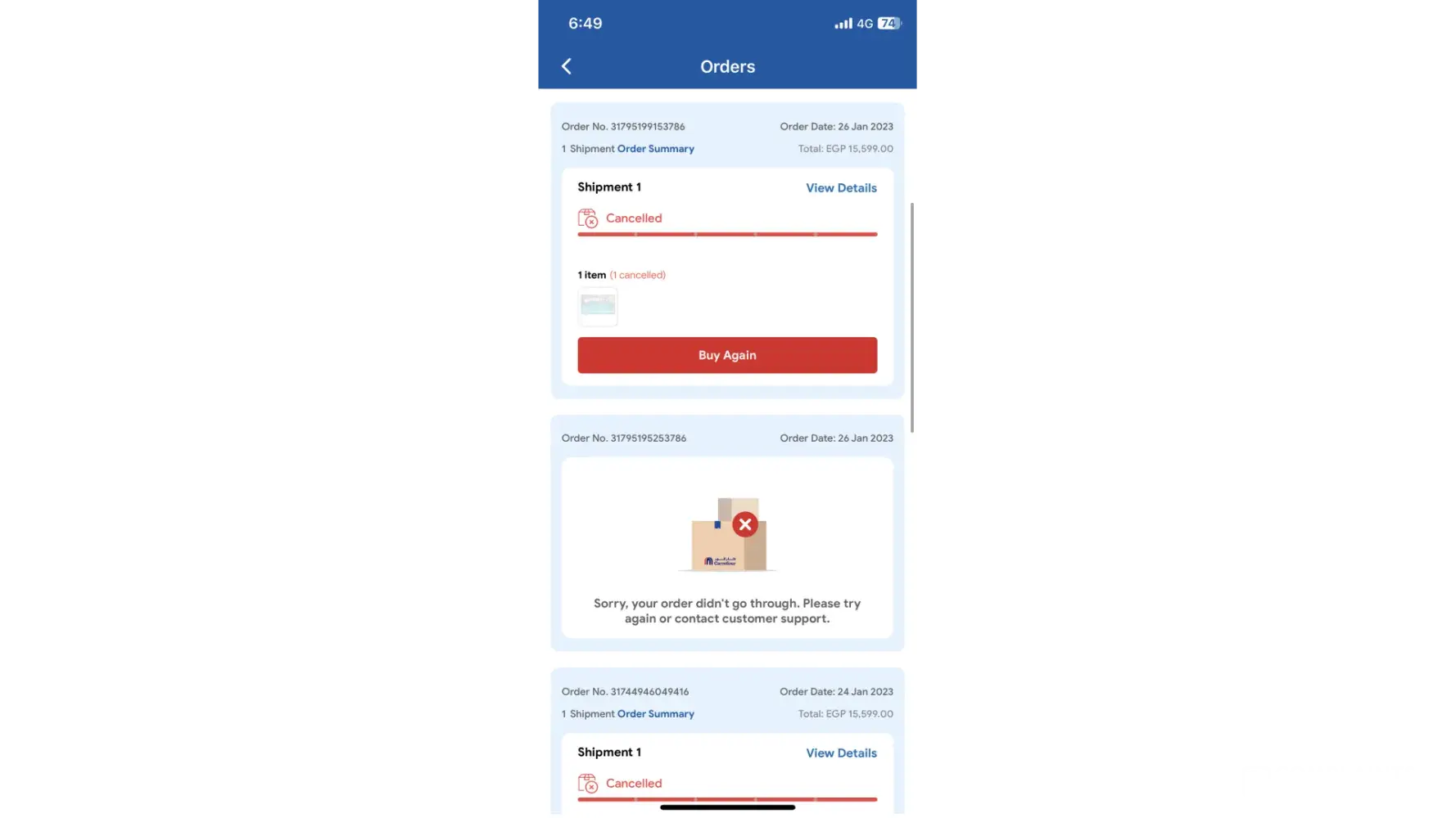 Carrefour Egypt I ordered a TV they first cancelled the order same day & asked to reorder & I did but they waited from 12 Jan till 16 Jan to cancel again on the delivery date & ask to reorder for the third time but they changed the price & when I called the holiness & asked why it was cancelled again they said because you ordered more than one time & reordered because the cancelled it