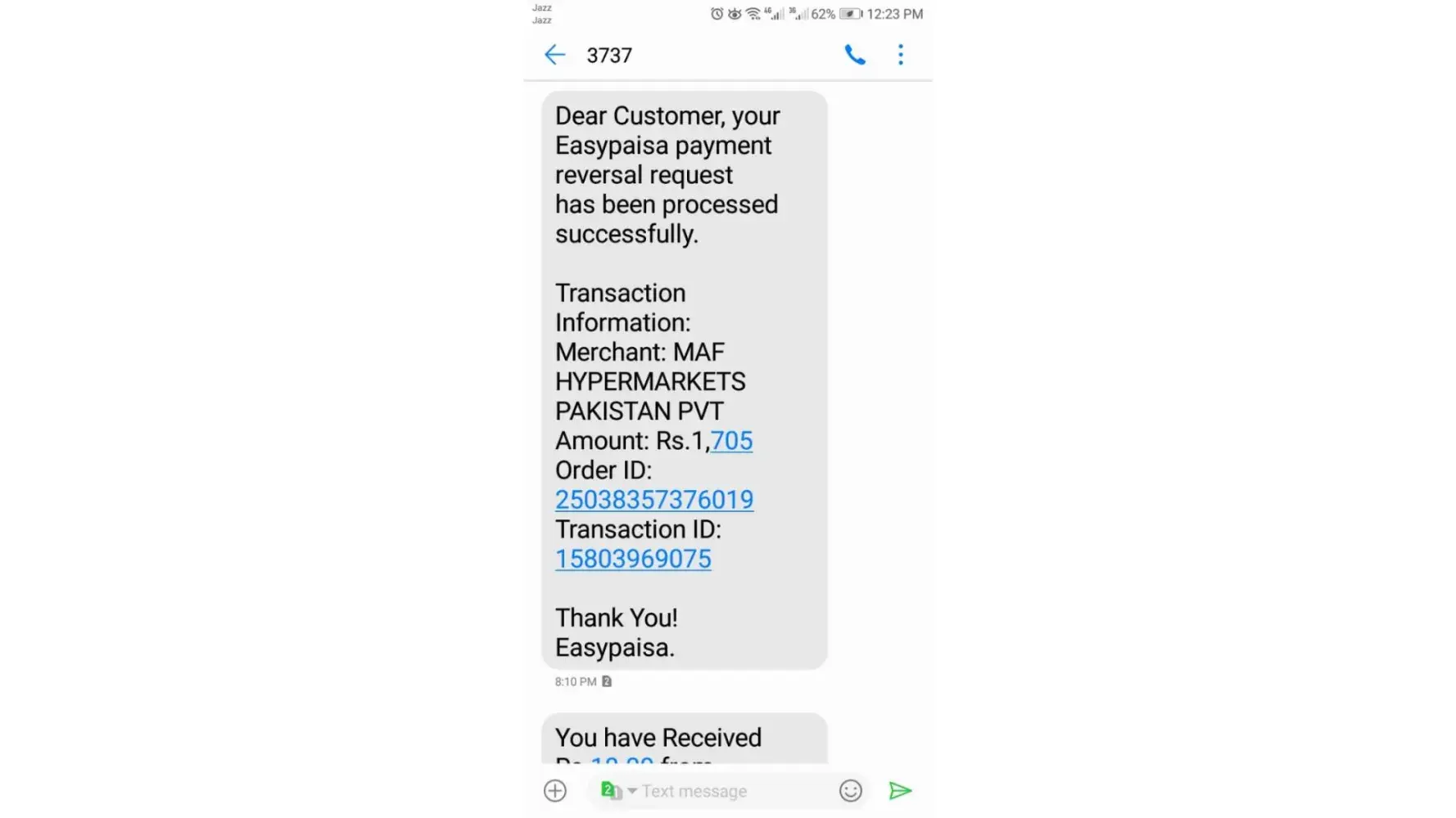 I order groceries from carrefour app on 30 march 2022 my order number is [protected] and the amount of my bill is 4744 pkr which I paid from my easy paisa account carrefour has two delivery options here in pakistan one is express and other is normal in express delivery service groceries will deliver in 60 minutes and in normal delivery it will deliver in 6 to 8 hours some of my items was booked in express delivery whose amount is 1705pkr and some items was booked in normal delivery whose amount is 3131pkr but they dont deliver both of the orders but they refund the amount of express delivery in 15 minutes which is 1705 pkr on the other day when the time of normal delivery come they cancelled it too and do not refund my amount of 3131pkr till date I call on their customer service number [protected] again and again but they didnot respond on my complain I request you to kindly look upon my complain and reslove my issue asap I am very depressed because of this