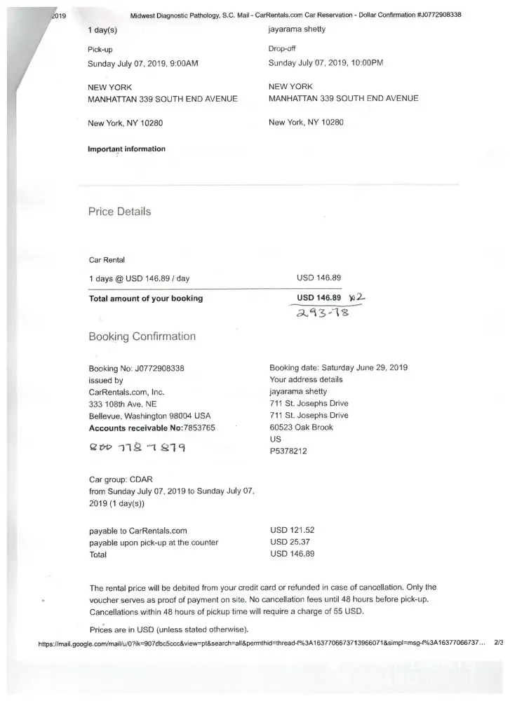 Description: Under the above booking, a car was reserved by Car Rental.com with Dollar rent a car to pick up a Ford focus car for one day at 339 South End Avenue Manhattan New York. When I presented the Booking number, Dollar car rental told me they could not rent the car for quoted Total price/day of $146.89. There was no customer service # for car Rentals .com to contact also. I ended up renting the car at the rate of $161.54 and paid a total of $323.07 for 2 days