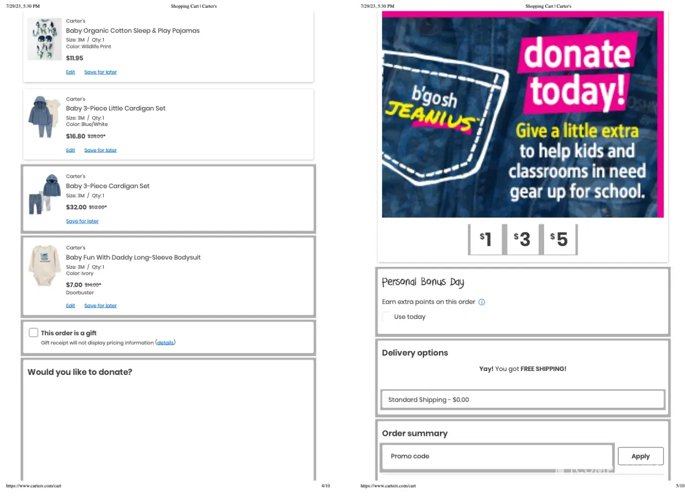 I believe Carters' conduct is deceptive and unfair to consumers. By charging an inflated amount on the checkout page, they are taking advantage of unsuspecting customers, including myself, and essentially overcharging for their products, in violation of consumer protection laws.